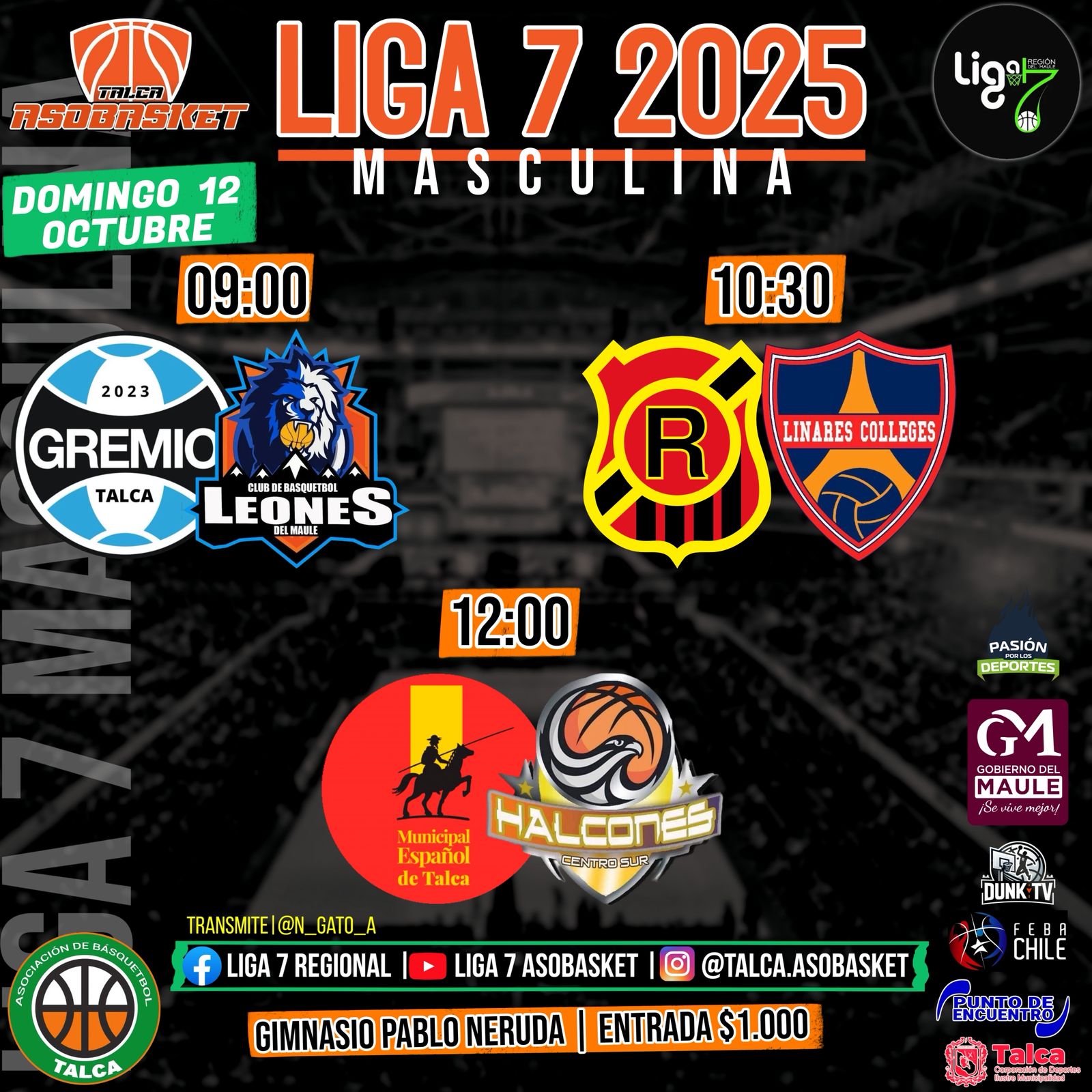 La adrenalina del básquetbol se toma la ciudad. Este sábado 11 de octubre, desde las 10:00 horas en el Gimnasio Cendyr Sur, y el domingo 12 de octubre, a partir de las 09:00 horas en el Gimnasio Pablo Neruda, se disputarán los esperados play offs de la Liga 7 Masculina de Básquetbol 2025.